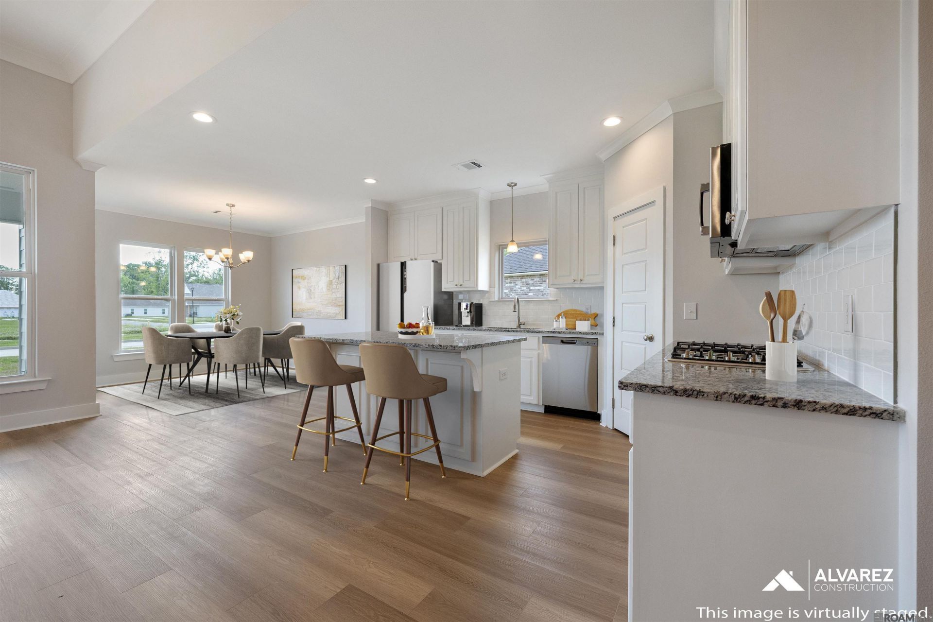 4.99% (5.73%) interest rate on GOV loans + closing cost assistance available! Estimated completion: complete and ready to move in *TO BE ELIGIBLE FOR A LOW INTEREST RATE ON GOV LOANS & CLOSING COST ASSISTANCE, A BUYER MUST USE SELLER'S PREFERRED MORTGAGE & TITLE COMPANY. NOT AVAILABLE ON ALL HOMES. OTHER RESTRICTIONS APPLY. CONTACT COMMUNITY SALES MANAGER FOR DETAILS.* Discover The Ash, a beautifully designed single-story home by Alvarez Construction offering 3 bedrooms, 2 baths, and 2,014 sq ft of open living space. The open-concept layout connects the living, dining, and kitchen areas, featuring granite countertops, custom cabinetry, stainless appliances, a gas cooktop, wall oven, chef's island, and walk-in pantry. The private primary suite includes dual vanities, soaking tub, separate shower, and walk-in closet. Additional highlights include a home office, large utility room, covered rear patio, and energy-efficient features.